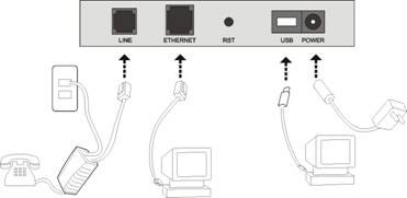 4. فیش آداپتور برق مودم را متصل نموده و مودم را روشن نمایید 5. کابل USB را به مودم وصل نموده و سر دیگر آن را به کامپیوتر متصل نمایید.